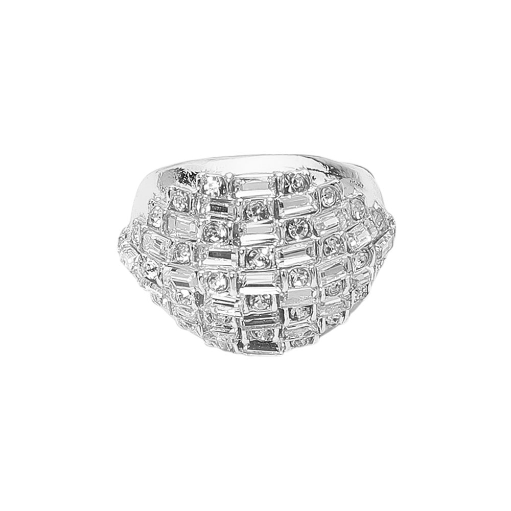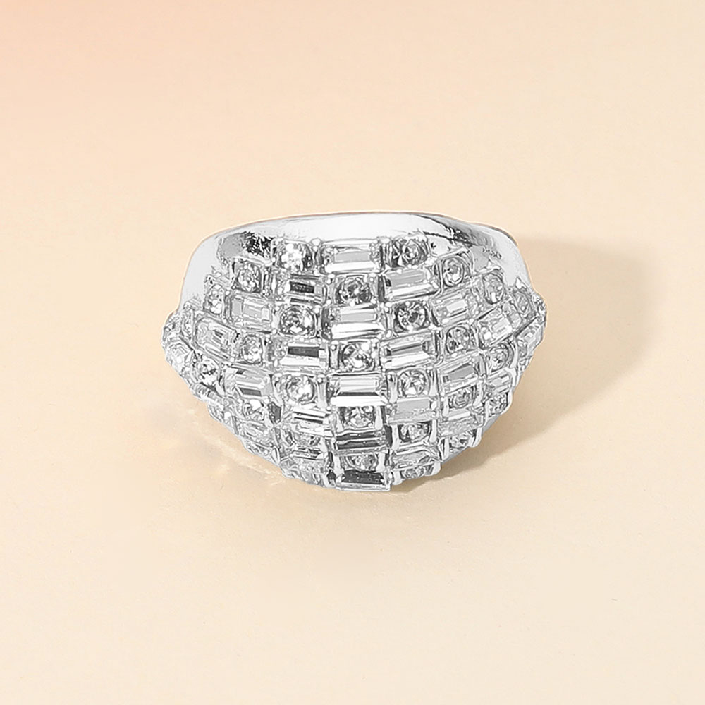 • This checkered crystal statement ring features a bold grid pattern with alternating shimmering stones that create a striking visual contrast. Designed for confident, trend-forward style, it adds instant sophistication and sparkle to any outfit, from elegant eveningwear to modern casual looks.