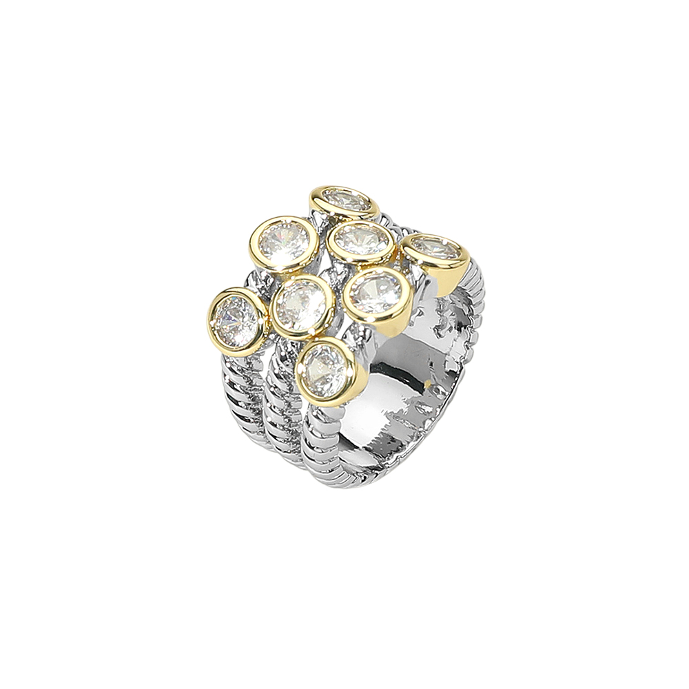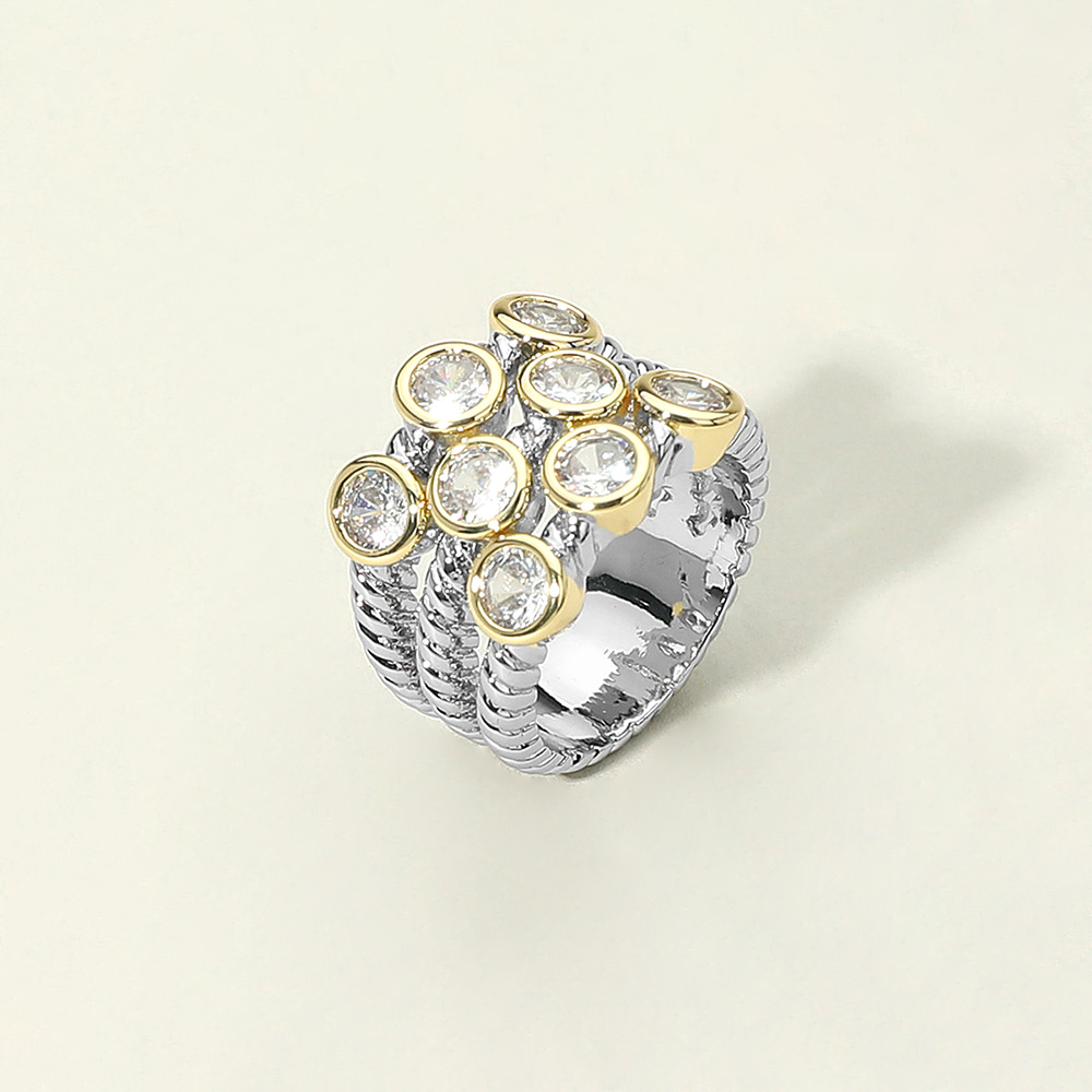 Details • Size : 0.6" H • Add modern elegance to your look with this multi-stone cluster statement ring. Designed with a layered band and bezel-set stones, it offers a bold yet refined sparkle, perfect for both special occasions and everyday glamour. • CZ Cubic Zirconia