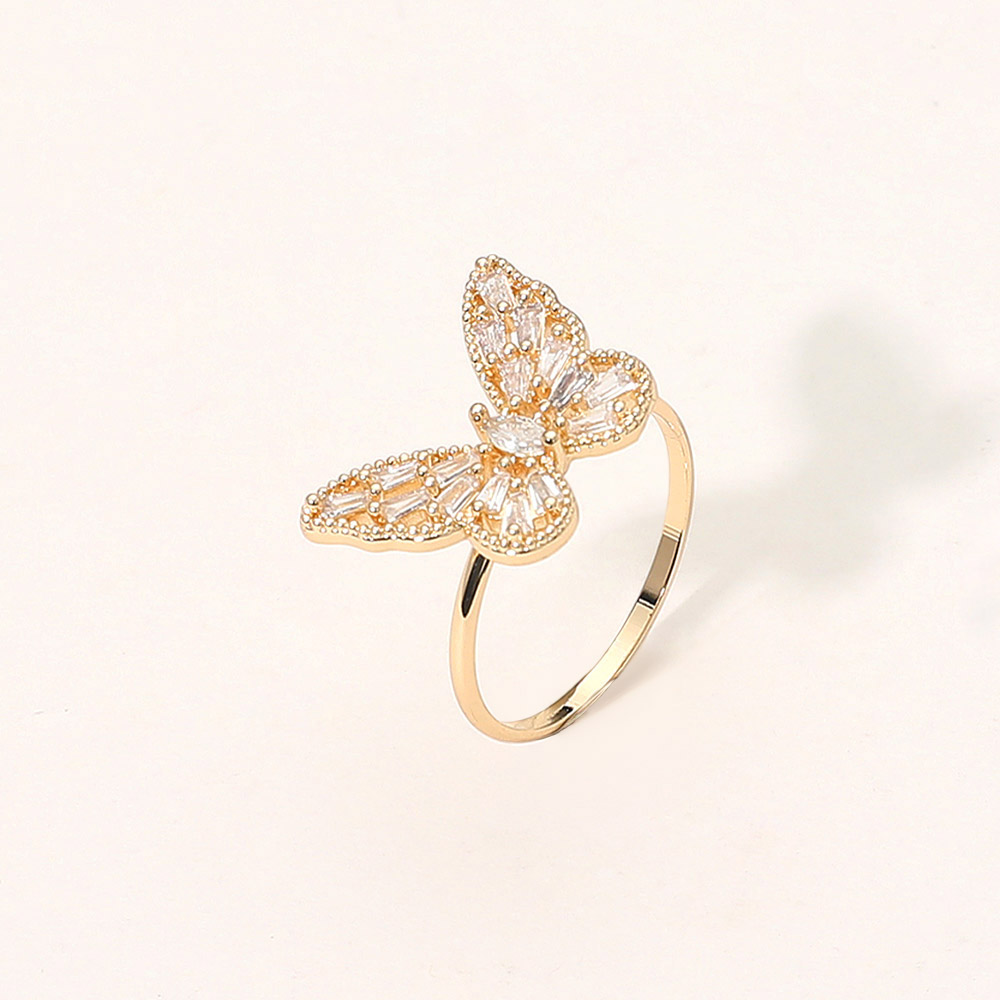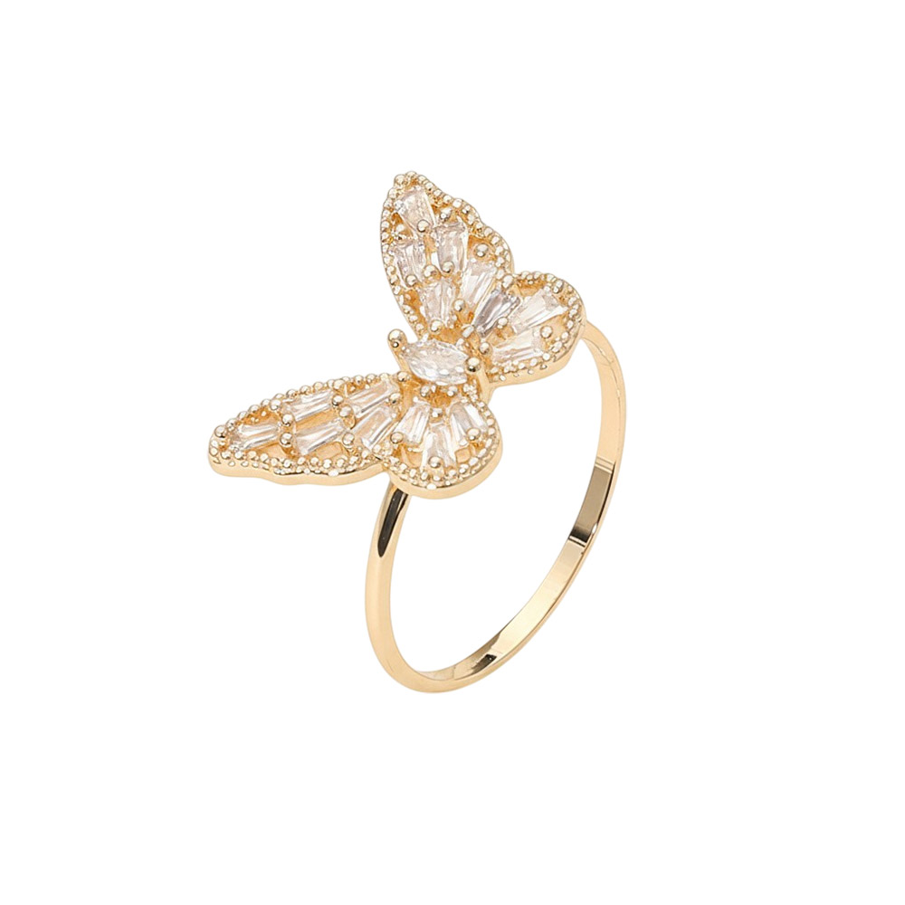 Details • Size : 0.5" H • Size 7 Only • Graceful adjustable ring featuring a butterfly shape adorned with shimmering crystal accents. Perfect for adding an elegant and feminine touch to any outfit, this delicate design brings sparkle and charm to everyday looks or special occasions. • Lead and Nickel Compliant • Brass