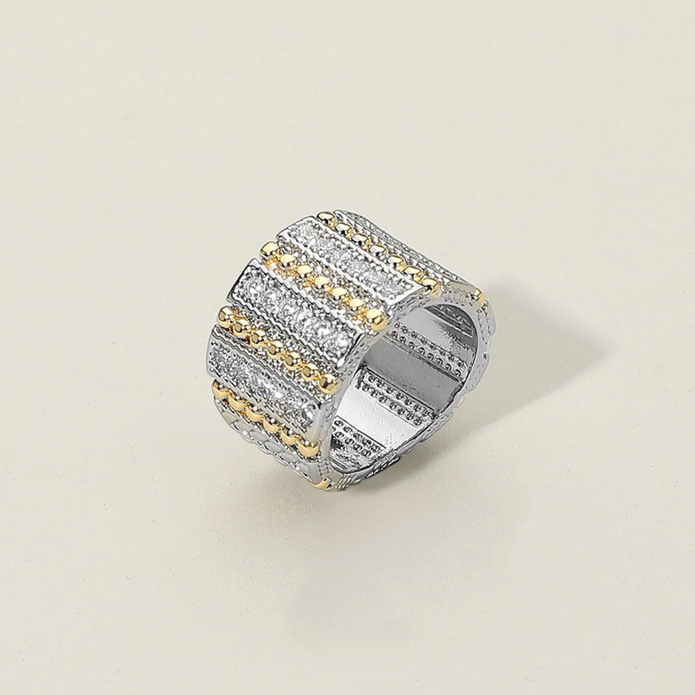 Details • Size : 0.6" H • A bold wide-band ring designed with intricate textured detailing that adds depth and sparkle from every angle. Its layered look makes it a standout accessory, perfect for elevating everyday outfits or adding a touch of radiance to special-occasion styles. • CZ Cubic Zirconia