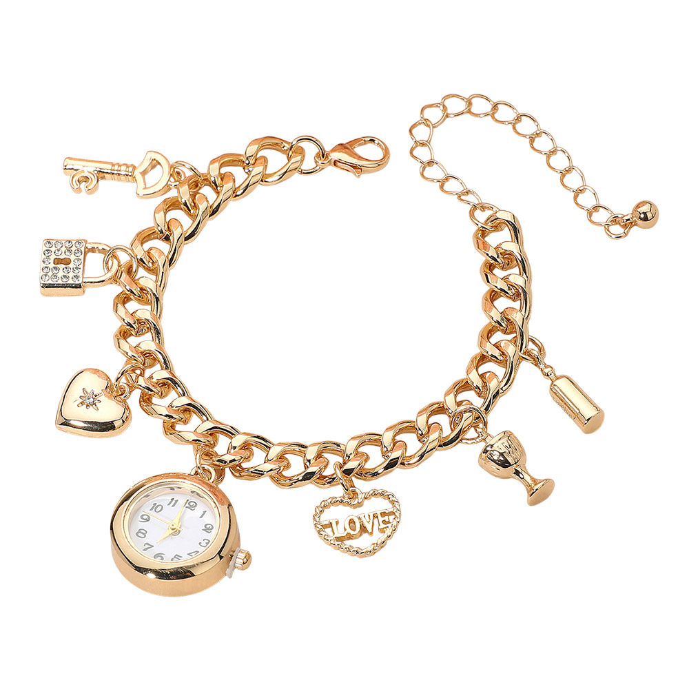 • Add sparkle and romance to your wrist with this love charm bracelet watch. Designed with a polished chain and detailed charms including a heart, key, and goblet, it perfectly blends fashion and function, making it an ideal accessory for both everyday and special occasions.