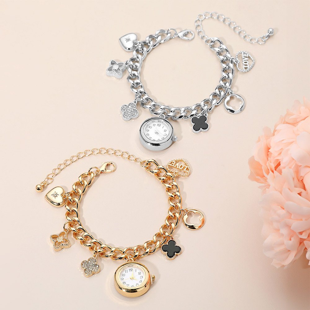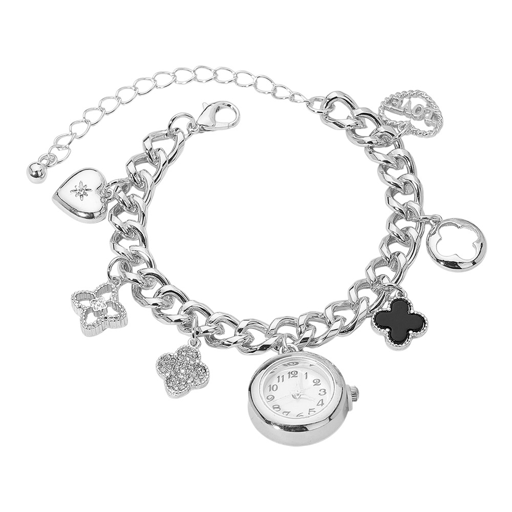 • Add sophistication to your look with this charm bracelet watch. Featuring a chic chain design adorned with heart and clover charms, it blends style and practicality effortlessly. A perfect accessory that doubles as a timepiece, bringing sparkle and elegance to any outfit.