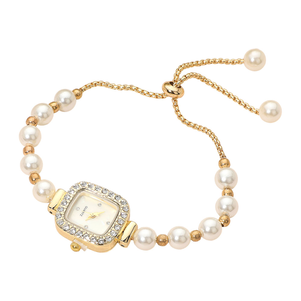Details • Size : 0.9" H • Adjustable • Water Resistant • Elegant bracelet watch featuring pearl-style accents and a crystal-framed square dial with an adjustable slider chain for a customized fit. Designed to blend timekeeping with jewelry styling, this chic piece transitions effortlessly from everyday wear to evening looks with graceful shine and sophistication. • Hypoallergenic • Stainless Steel