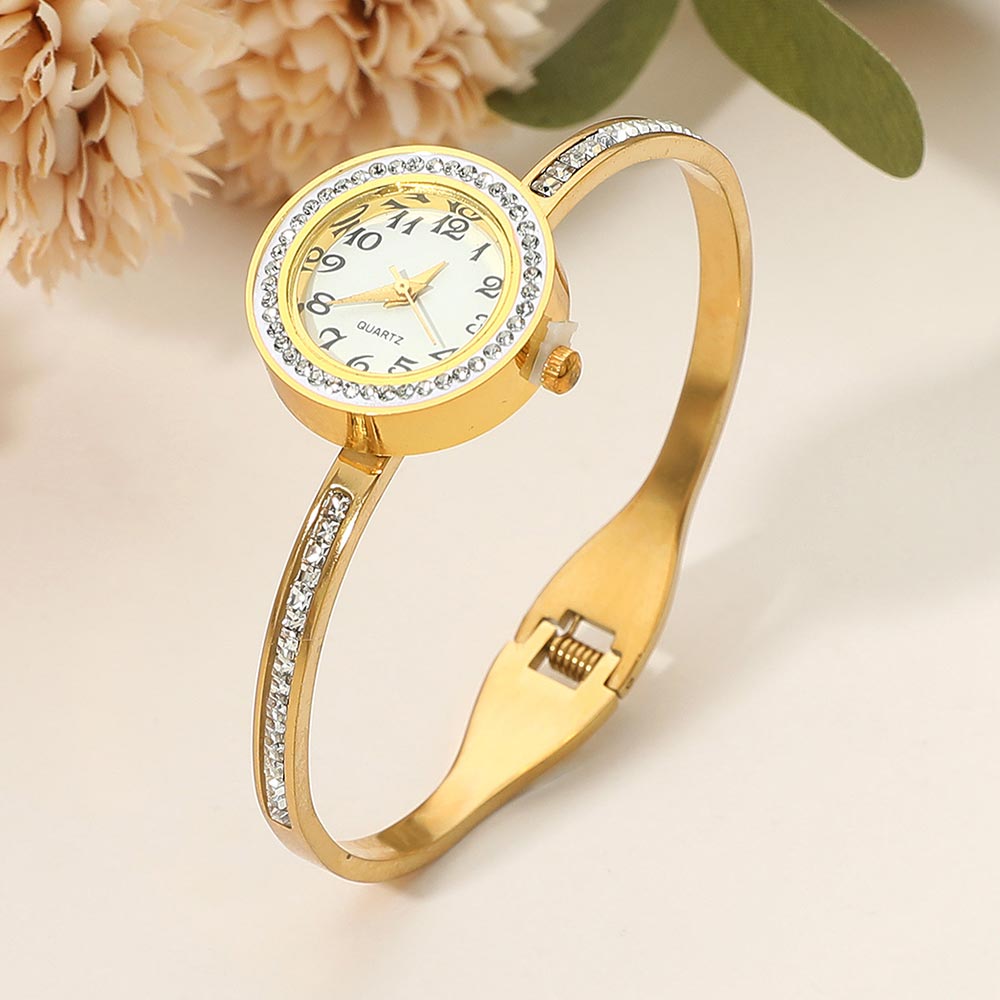 Details • Size : 0.9" H, 2.4" D • Hinged Closure • Water Resistant • Elevate your everyday look with this stunning crystal bangle watch featuring a slim bracelet design and shimmering accents. The elegant round dial and refined quartz movement make it a perfect blend of style and precision, ideal for both casual and formal wear. • Hypoallergenic • Stainless Steel