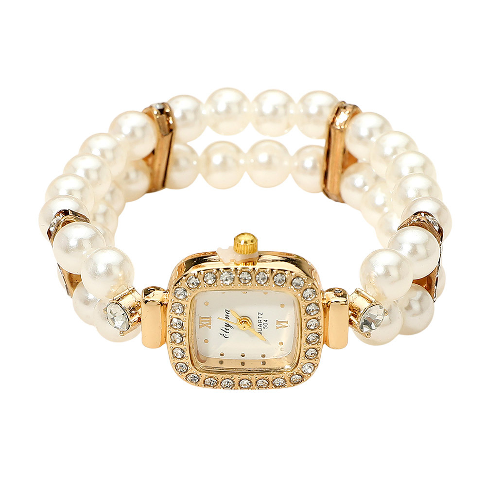 Details • Size : 0.8" H • Stretchable • Refined and feminine, this square dial quartz watch features a double pearl strap and a bezel adorned with sparkling crystals. Its timeless design blends elegance with everyday practicality, making it a standout accessory for both special occasions and daily wear. • Stainless Steel