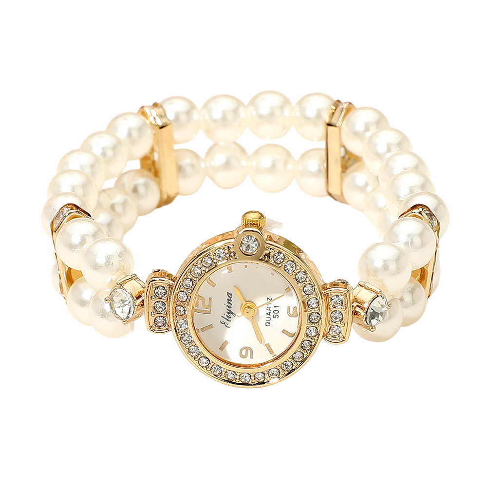 Details • Size : 0.9" H • Stretchable • Discover timeless elegance with this pearl strap quartz watch featuring rhinestone accents around the dial. Designed with a bracelet-inspired look, it combines the charm of jewelry with practical timekeeping, making it the perfect accessory for both casual and formal occasions.