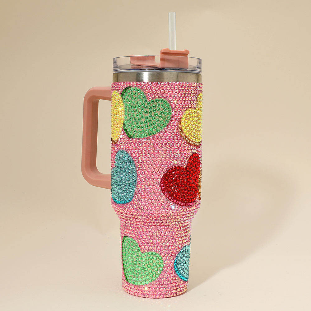 Details • Size : 4" X 10.5" (40oz) • Straw Size : 12" L • Lid, Straw and Brushes Included • Double Wall Vacuum Insulation • Cup Holder Friendly • Hot and Cold • Sparkling 40oz rhinestone heart tumbler with handle and straw, featuring a full-cover crystal design and tapered bottom for cup holder fit. Perfect for daily hydration, gifting, travel, and adding shine to any routine.