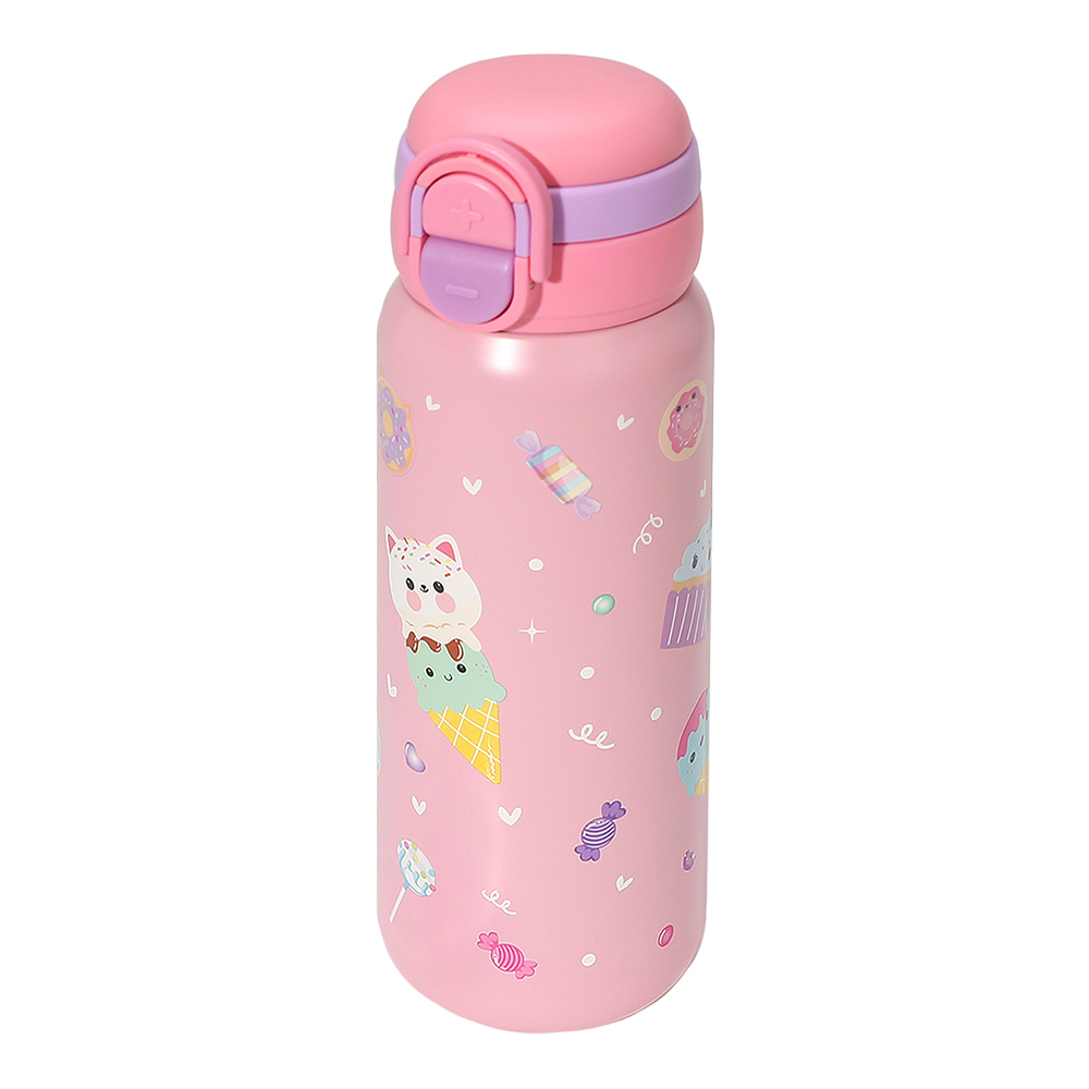 Details • Size : 2.5" X 9" (15.59fl.oz. / 550ml) • Sticker Size : 2.3" X 2.3" • Strap Size : 6.25" L • Pop Open • Easy Carry with Strap • BPA Free • Do not microwave • Not intended for hot liquids • Clean water bottle with dish soap and warm water before use • Hand wash only • 1 Double lid Stainless Steel Water Bottle, 1 Grow in the Dark Nail Sticker Included • Stainless Steel