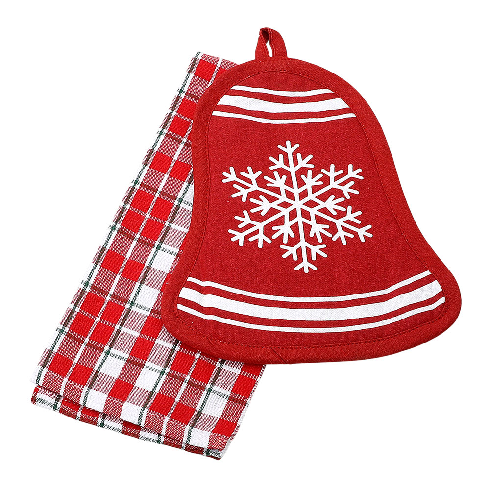 Details • Towel Size : 15" X 25" • Potholder Size : 8.75" X 10.25" • Material : 100% Cotton • Holiday Bell Snowflake Kitchen Set – A 2-piece festive kitchen set featuring a bell potholder and plaid towel. Perfect for cooking, baking, or decorating your kitchen with a touch of seasonal charm. A thoughtful and stylish holiday gift for home cooks. • Made In India