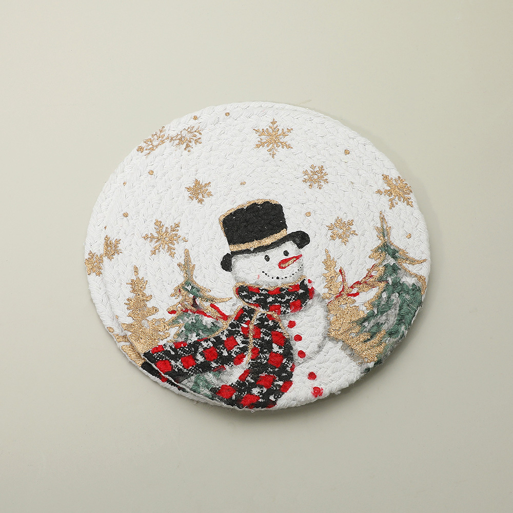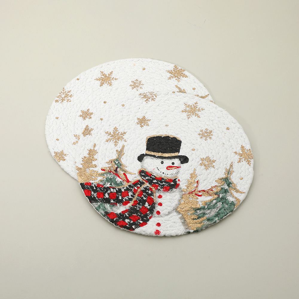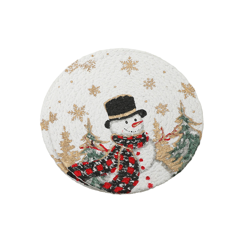 • Add winter cheer to your holiday dining with these round placemats featuring a jolly snowman in a scarf surrounded by golden snowflakes and trees. Perfect for seasonal meals, entertaining, and festive table dĂ©cor.