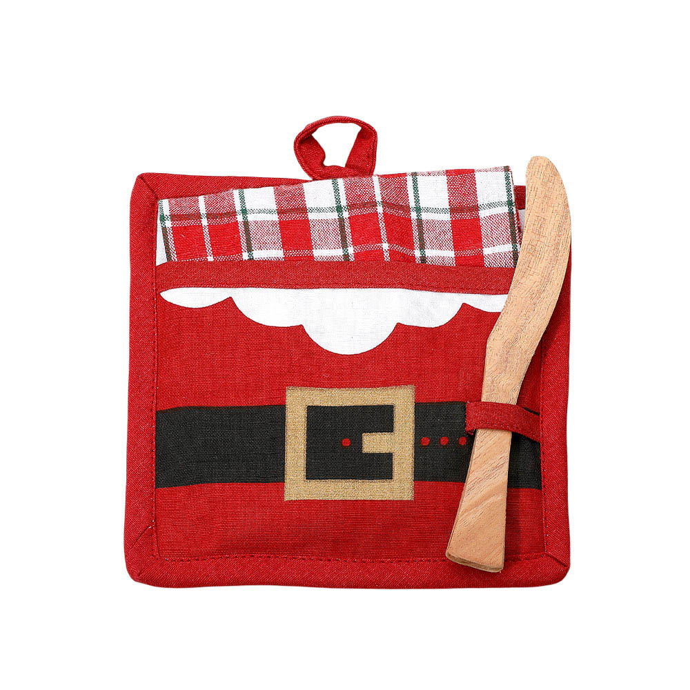 • Add festive cheer to your kitchen with this holiday set featuring a plaid towel, Santa belt potholder, and wooden spreader. Perfect for baking, cooking, and entertaining, this set blends seasonal style with practical function, making it a thoughtful holiday gift or dĂ©cor accent.
