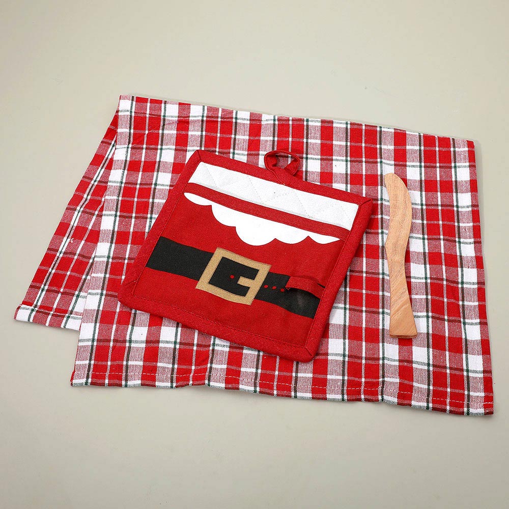 3PCS - Holiday Plaid Kitchen Towel Santa Potholder Wooden Spreader Set