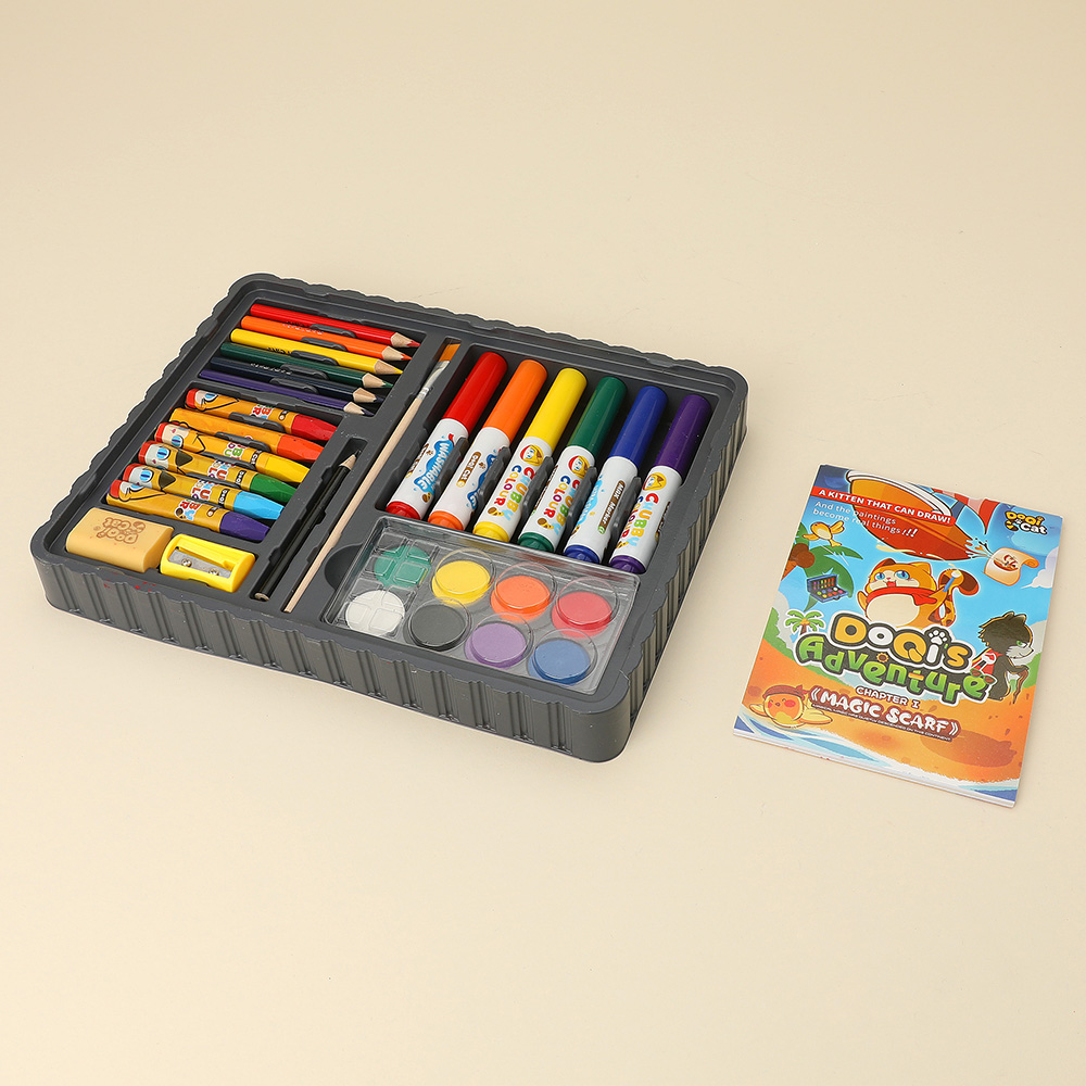 Details • Size : 10.25" X 8" X 12" • Strap Size : 47" L / Adjustable, Detachable • 6 Washable Markers, 6 Color Pencil Crayons, 1 Coloring Comic Book, 1 Eraser, 1 Sharpener, 1 Brush, 1 HB Pencil, 1 Palette, 8 Watercolor, 15 Stickers and 6 Color Pencils Included • Inspire creativity with this 47-piece kids art set featuring pencils, markers, paints, crayons, and more. Packed in a fun, easy-to-carry shoulder bag, it’s perfect for school projects, travel, or at-home art fun—designed to make every creative moment colorful and imaginative.