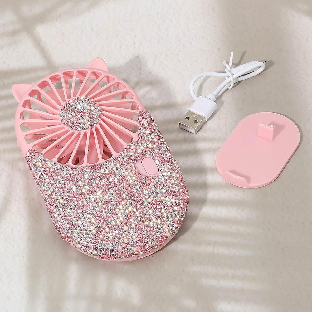 Details • Size : 3.2" X 5.25" X 1.5" • One Fan Holder Included • USB Charging Cable Included • This cat ear mini handheld fan features a compact design with decorative sparkle accents and a built-in stand for easy use. Lightweight and portable, it delivers refreshing airflow for travel, events, and everyday comfort. A fun novelty accessory that blends cute style with practical cooling, making it perfect for gifting, parties, and on-the-go use.