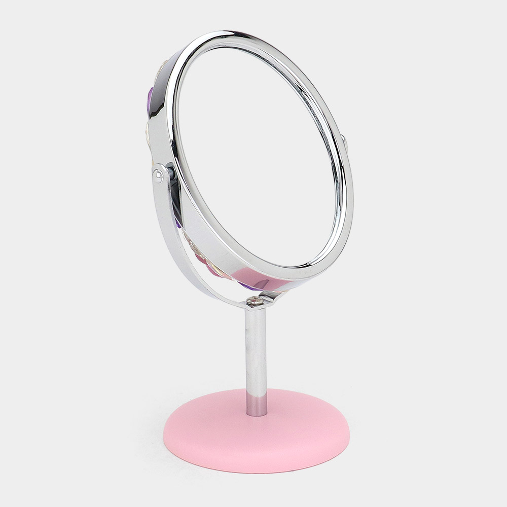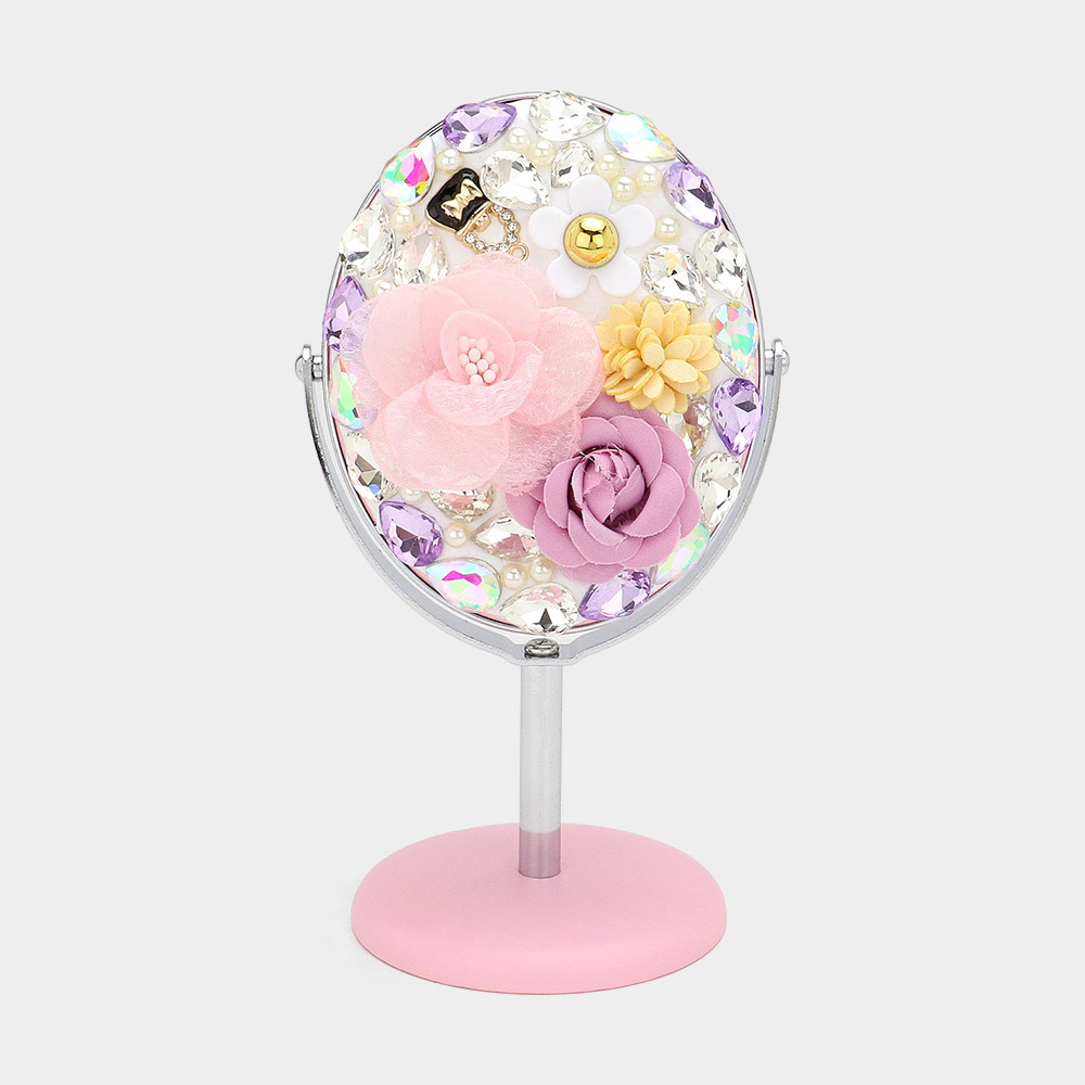 Flower Pearl Stone Embellished Oval Shaped Makeup Tabletop Swivel Mirror