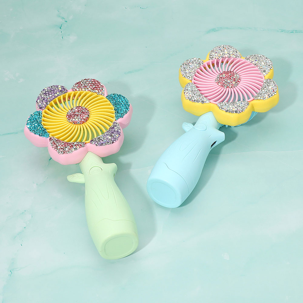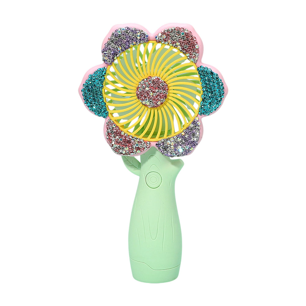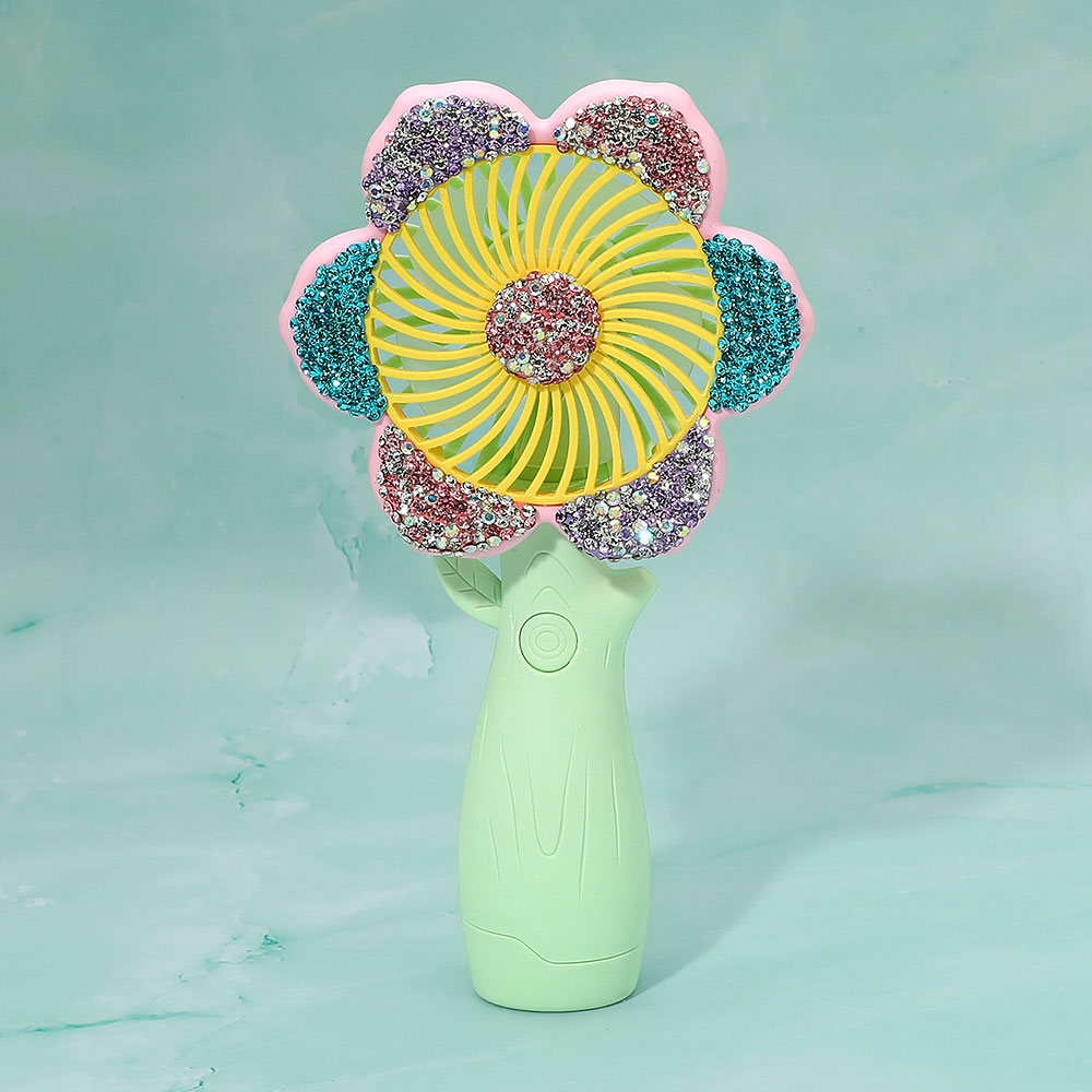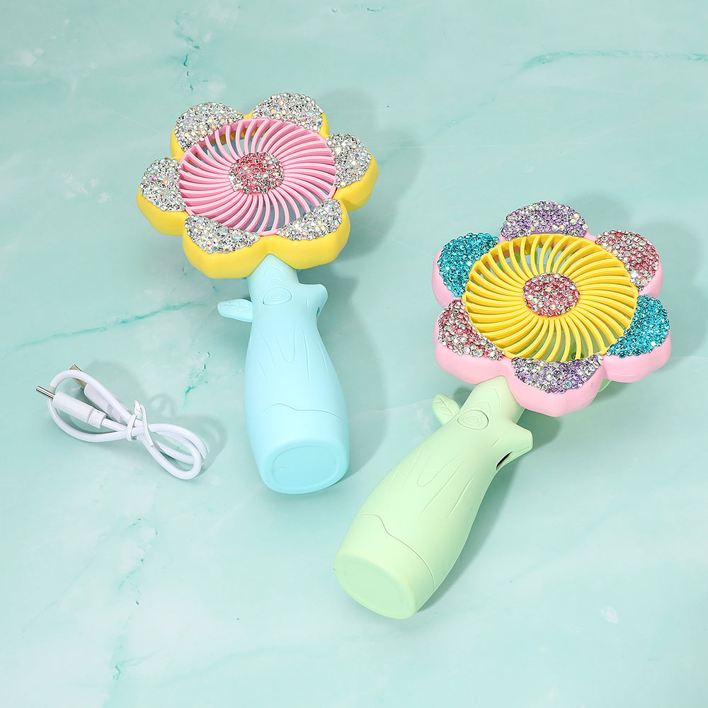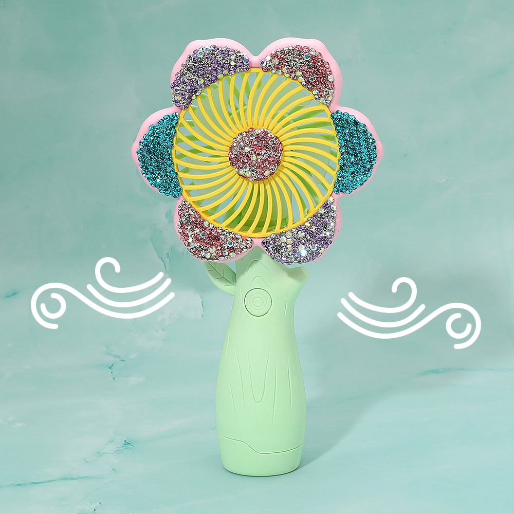 Details • Size : 3.8" X 6.8" • USB Charging Cable Included • Charming handheld fan shaped like a flower and adorned with sparkling glitter for a touch of whimsy. Delivers powerful airflow in a compact, rechargeable design, perfect for keeping cool on the go while adding style to your everyday essentials.