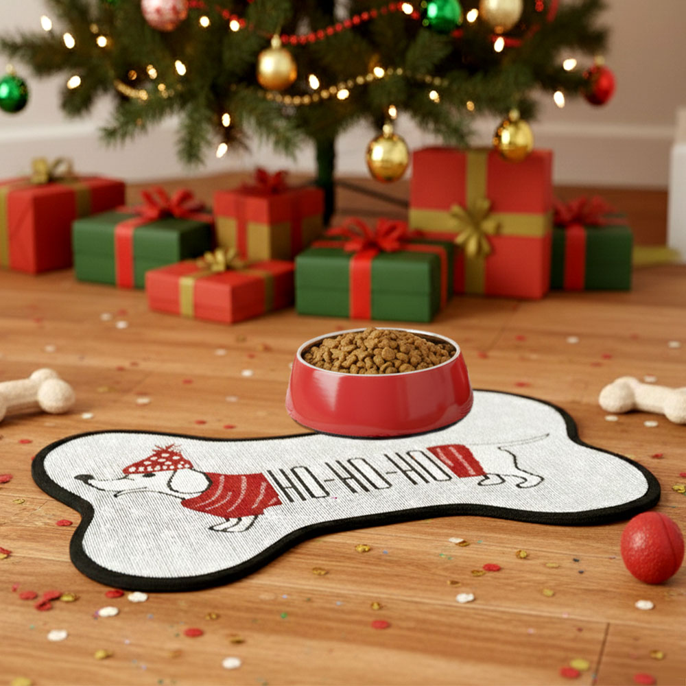 Details • Size : 19" X 13" • Material : 60% Cotton, 40% Polyester • Bring holiday cheer to your pet’s feeding station with this festive bone-shaped bowl mat featuring a playful dog in winter attire and “Ho-Ho-Ho” text. Perfect for keeping floors clean, reducing spills, and adding seasonal charm to your pet’s daily routine. • Made In India