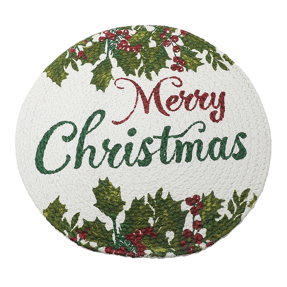 • Create a festive dining experience with this round 14-inch placemat featuring a bold "Merry Christmas" message surrounded by holly and berry accents. Perfect for holiday meals, parties, and seasonal table settings.