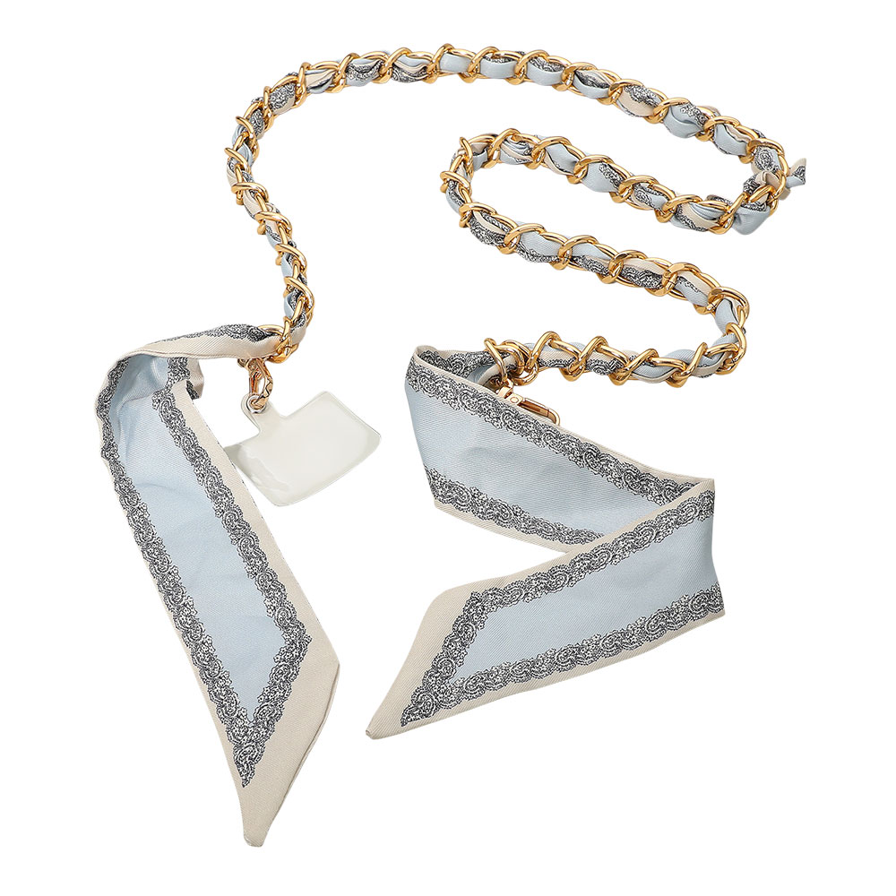 • Add a chic touch to your phone with this patterned scarf chain strap featuring an elegant border design and gold chain accents. Lightweight yet durable, it offers hands-free convenience and timeless style—perfect for elevating your everyday look or keeping essentials close in style.