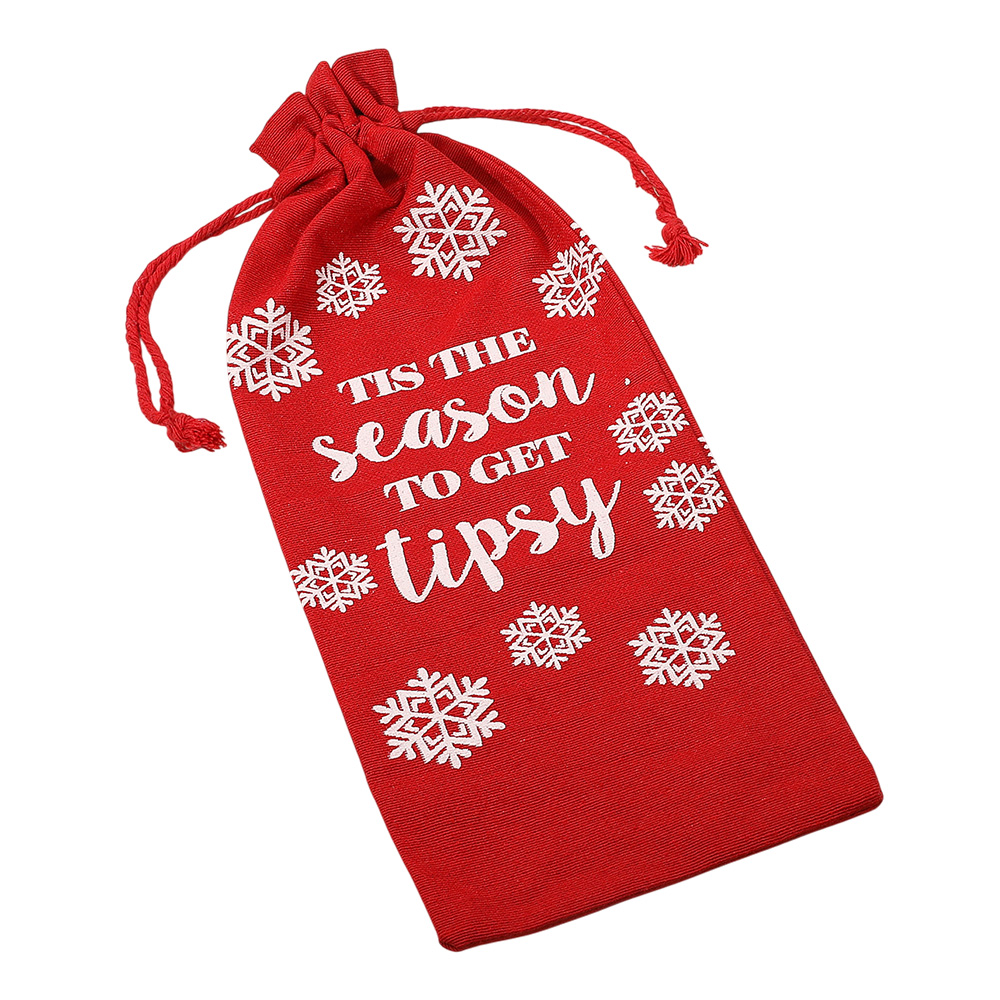 Details • Size : 6" X 14: • Material : 100% Cotton • Celebrate the holidays with this festive wine bag featuring snowflake accents and the phrase “Tis the Season to Get Tipsy.” Perfect reusable drawstring bag for gifting wine, champagne, or holiday spirits. • Made In India