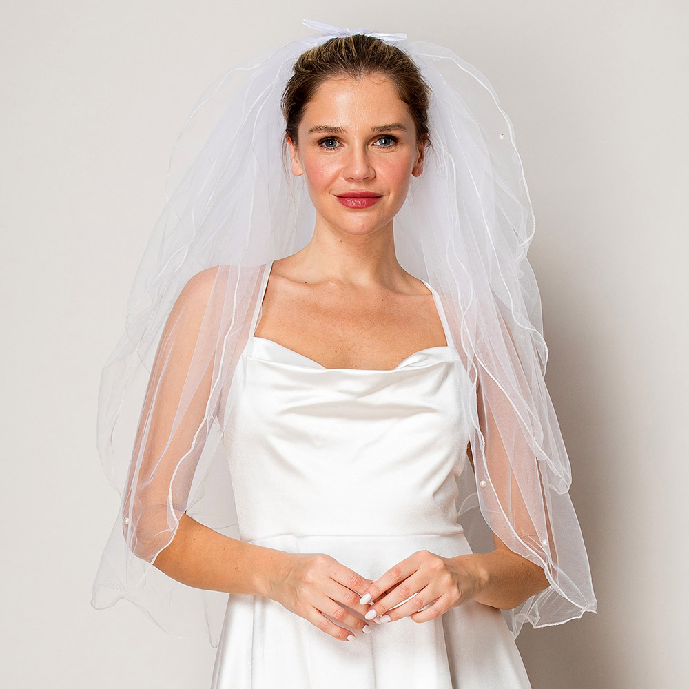 Details • Length : 32" L • Bow Size : 5.5" X 16" • This gorgeous three-tier bridal veil features delicate pearls scattered across the layers, offering a timeless and elegant touch for the modern bride. The layered design adds depth and volume, creating a graceful flow as you walk down the aisle. Perfect for brides who want to add a sophisticated and romantic detail to their wedding day ensemble.
