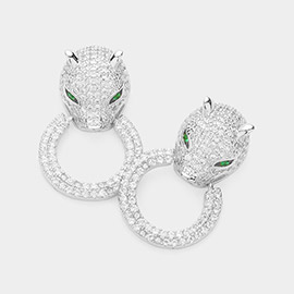 14K Gold Plated CZ Stone Paved Leopard Panther Twisted Open Rectangle Drop Earrings